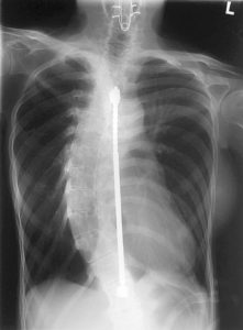 Follow up x-rays on these individuals show that about 22 years after surgery their scoliosis has returned to pre-surgery levels. The Harrington rods bend, break loose from the wires, or worse break completely in two. Corrosion (rust) is also found in two out of every three Harrington rod patients. After the operation, the average patient also suffers a 25% reduction in their spinal range of motion.